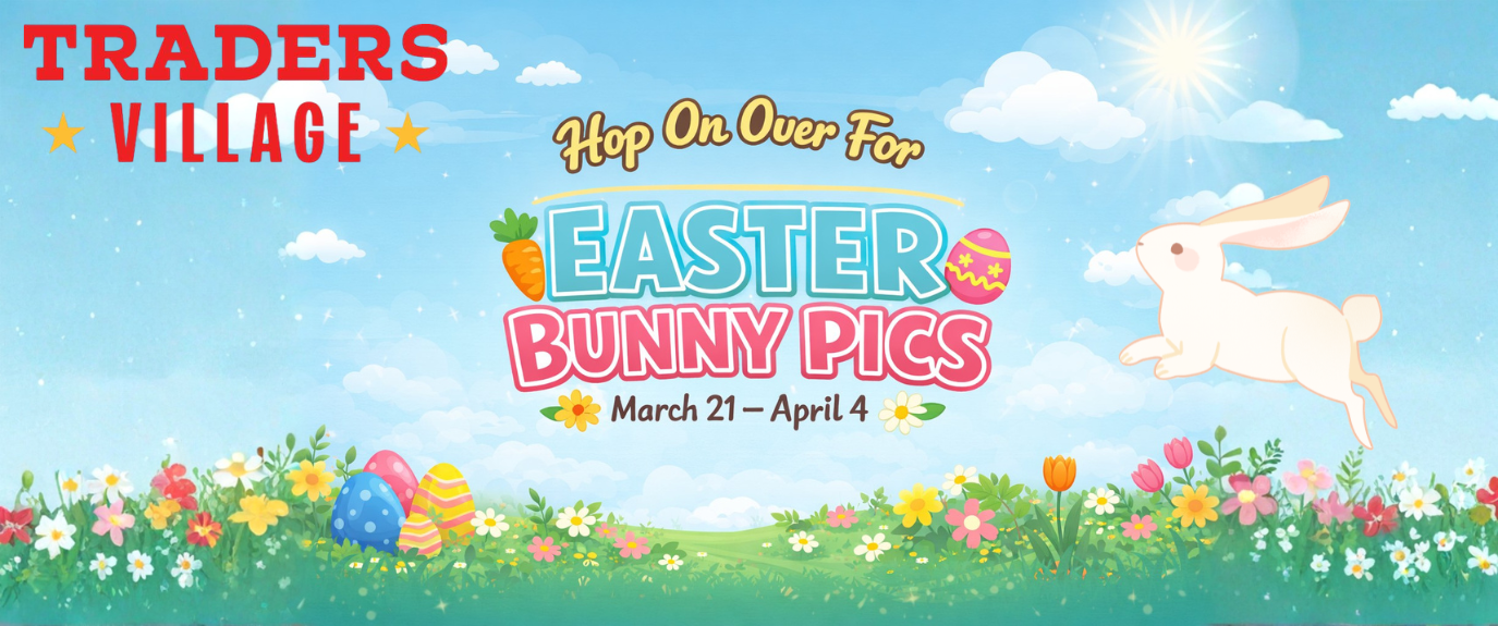 Easter Bunny Pictures at Traders Village San Antonio! Spring is here, and the Easter Bunny is ready for photos! Join us March 21 – April 4 under the Brown Expo…